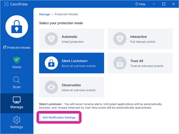 In CatchPulse Main Console window, click on the Manage → Protection Modes → Lockdown Mode icon.