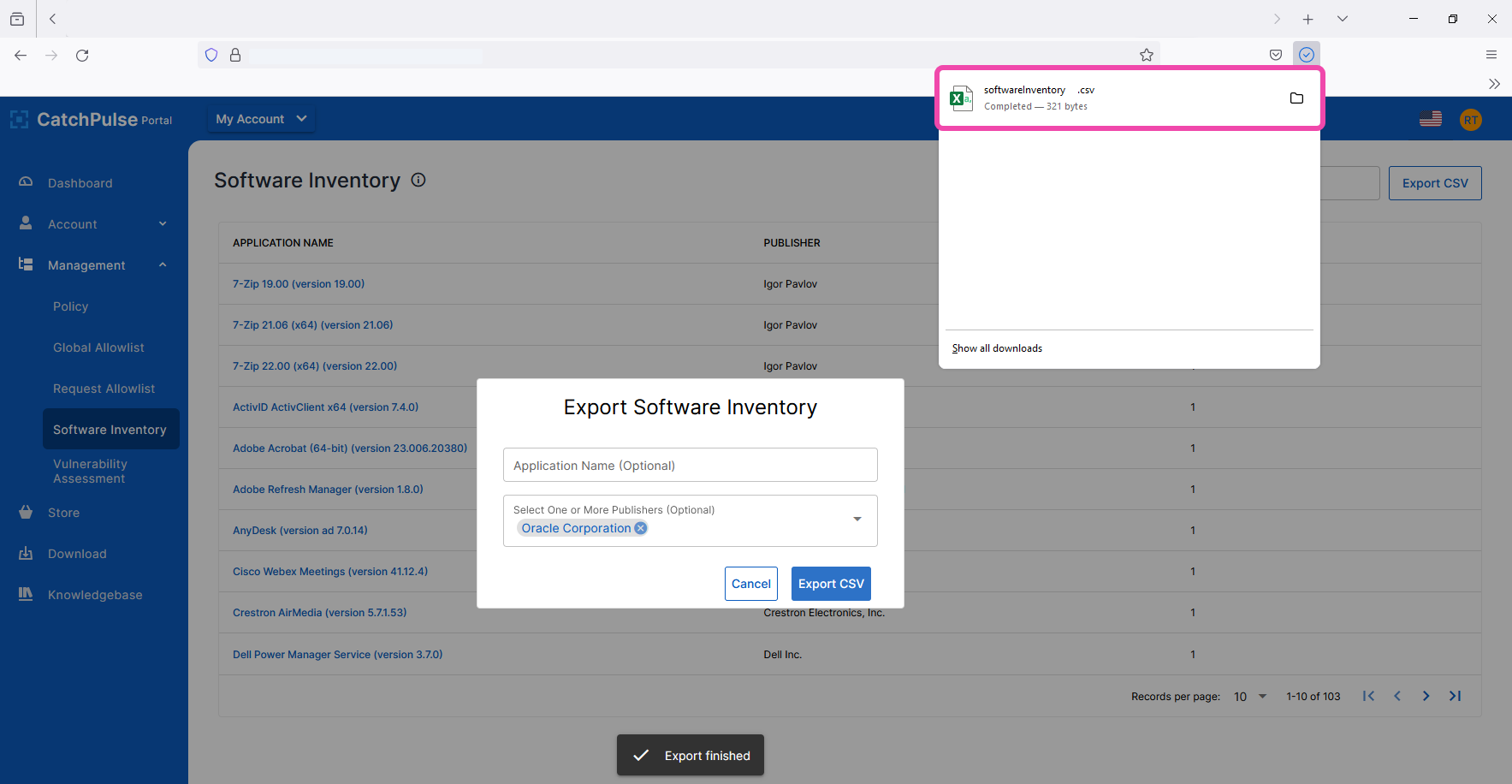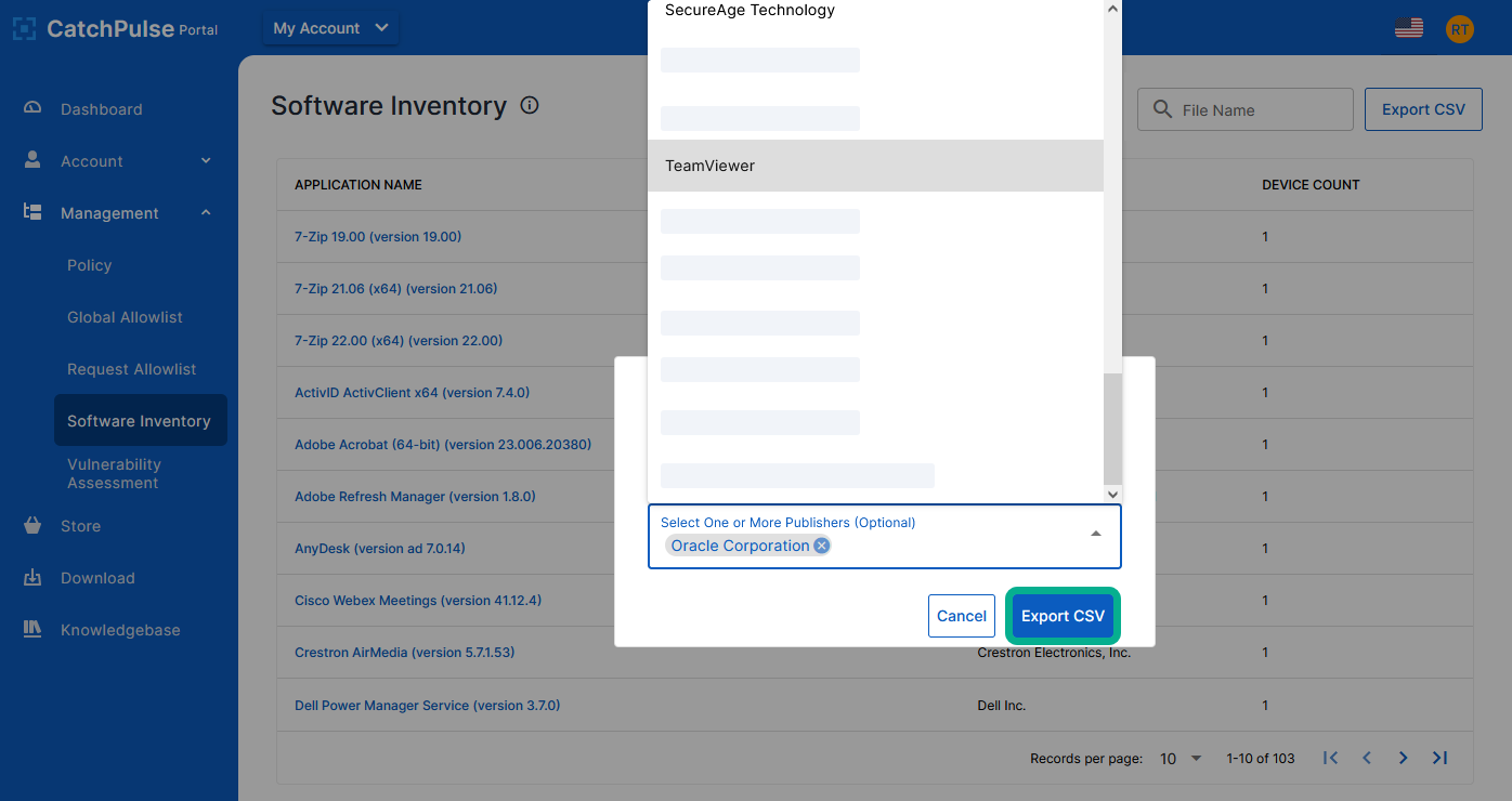 (Optional) In the Export Software Inventory display box, enter the Application Name (if any) and select and choose from the drop-down list if you'd want to export from a specific publisher.