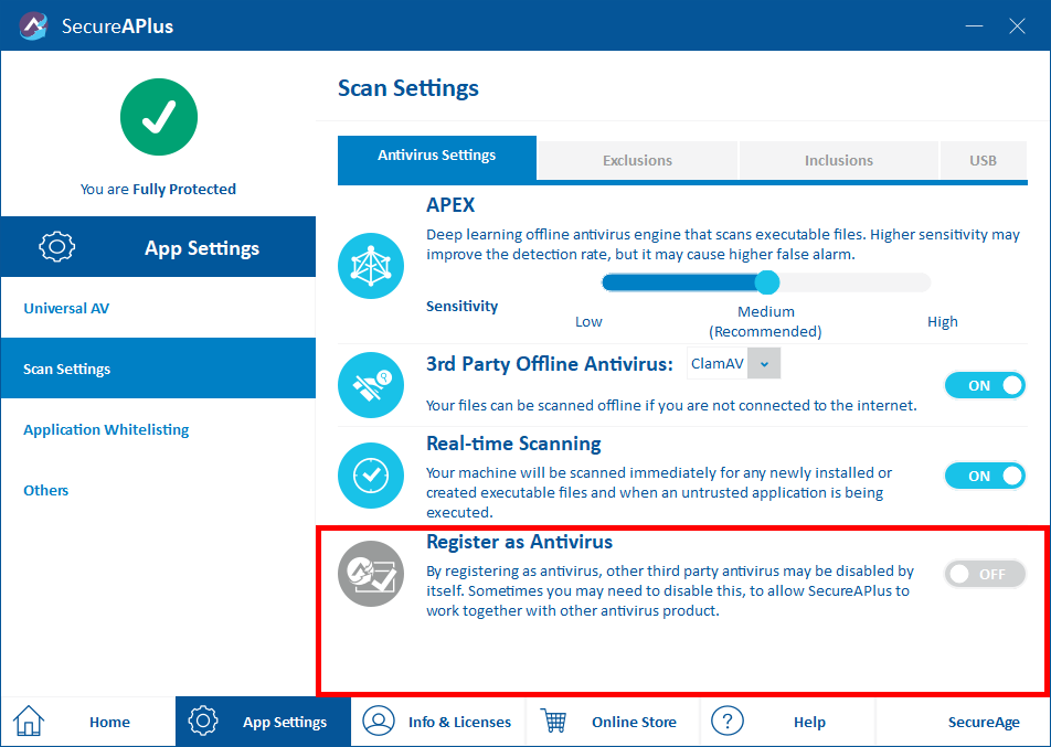 In the event that Windows Defender is not activated when it detects SecureAPlus registered as Antivirus, you may need to set Register as Antivirus to Off as follows: