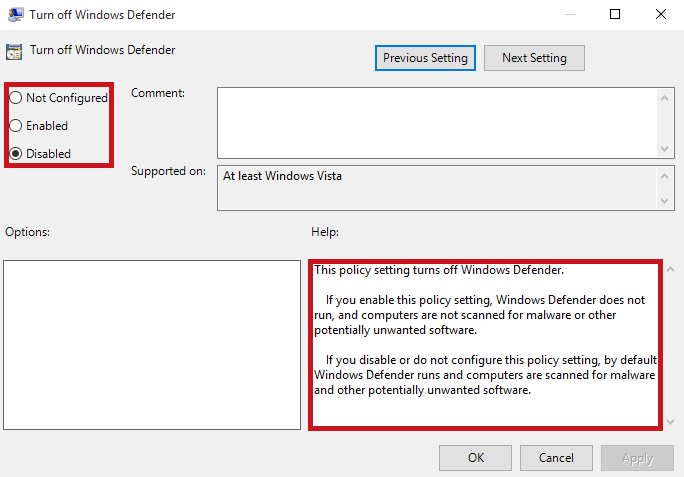 Switch the selection from “Not Configured” or “Enabled” to “Disabled“. Then click “OK” to apply the changes.