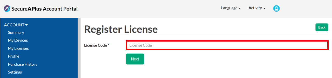 Note: Once a license has been associated with a SecureAPlus Account, it can no longer be added to another SecureAPlus Account. This is a good way to prevent anyone else from using an unused license that you have.